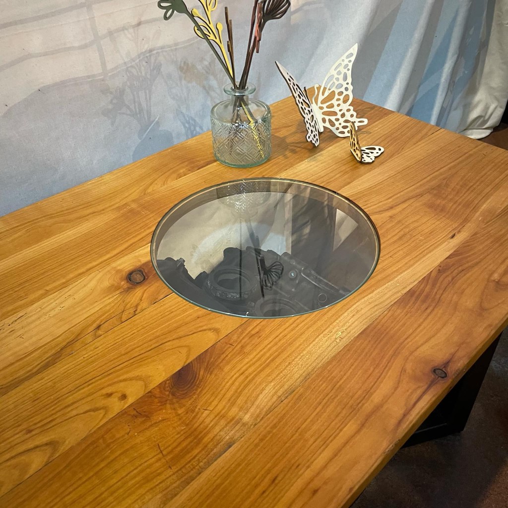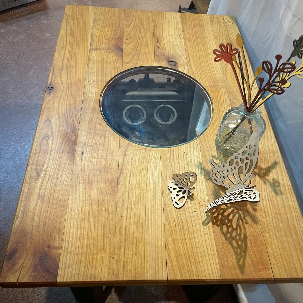 Planche à découper en hêtre avec un manche de raquette de tennis.